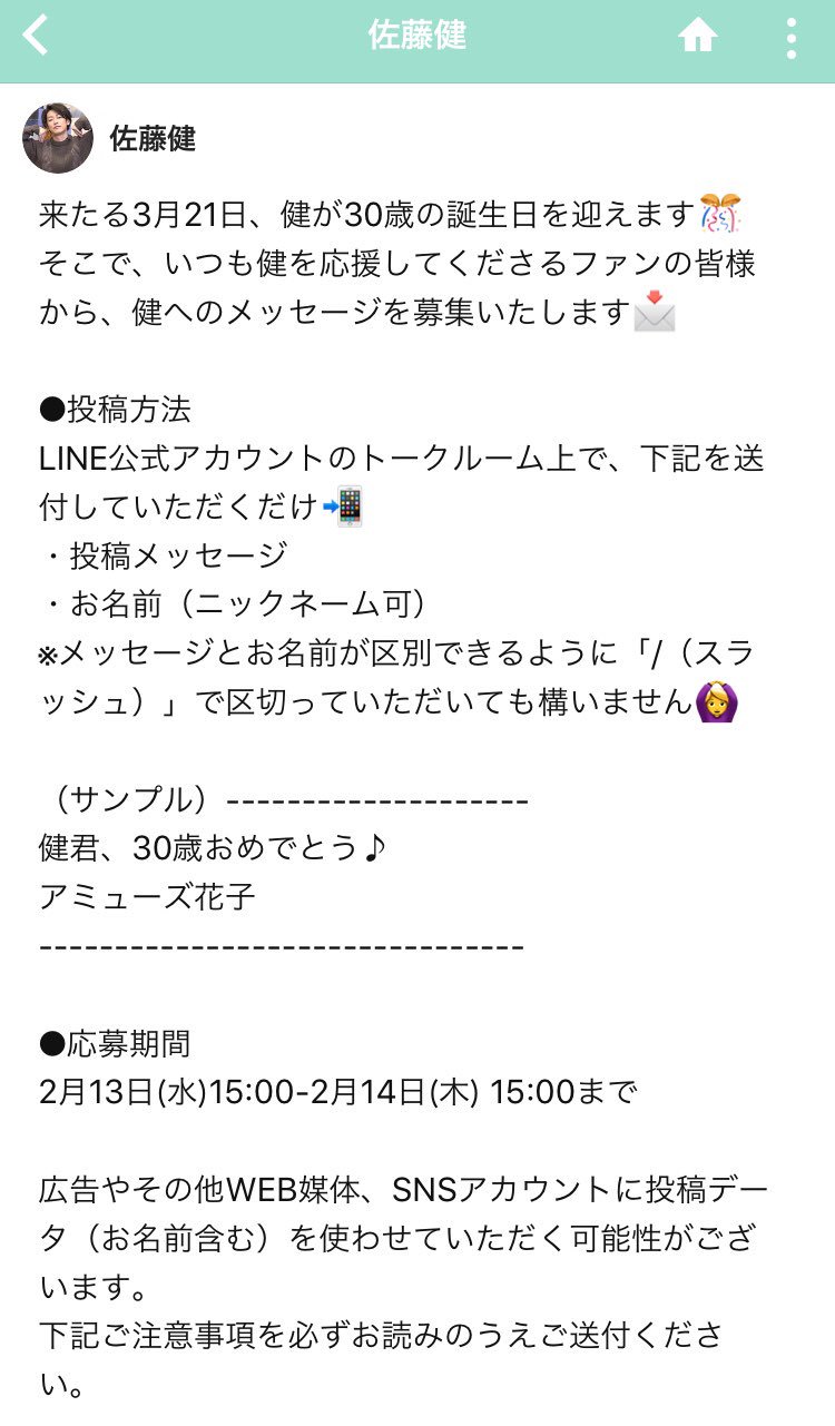 せり Sur Twitter 佐藤健 来たる3月21日 健が30歳の誕生日を迎えます そこで いつも健を応援してくださるファンの皆様から 健へのメッセージを募集いたします 応募期間 2月13日 水 15 00 2月14日 木 15 00まで T Co Lxgultqhnk T Co